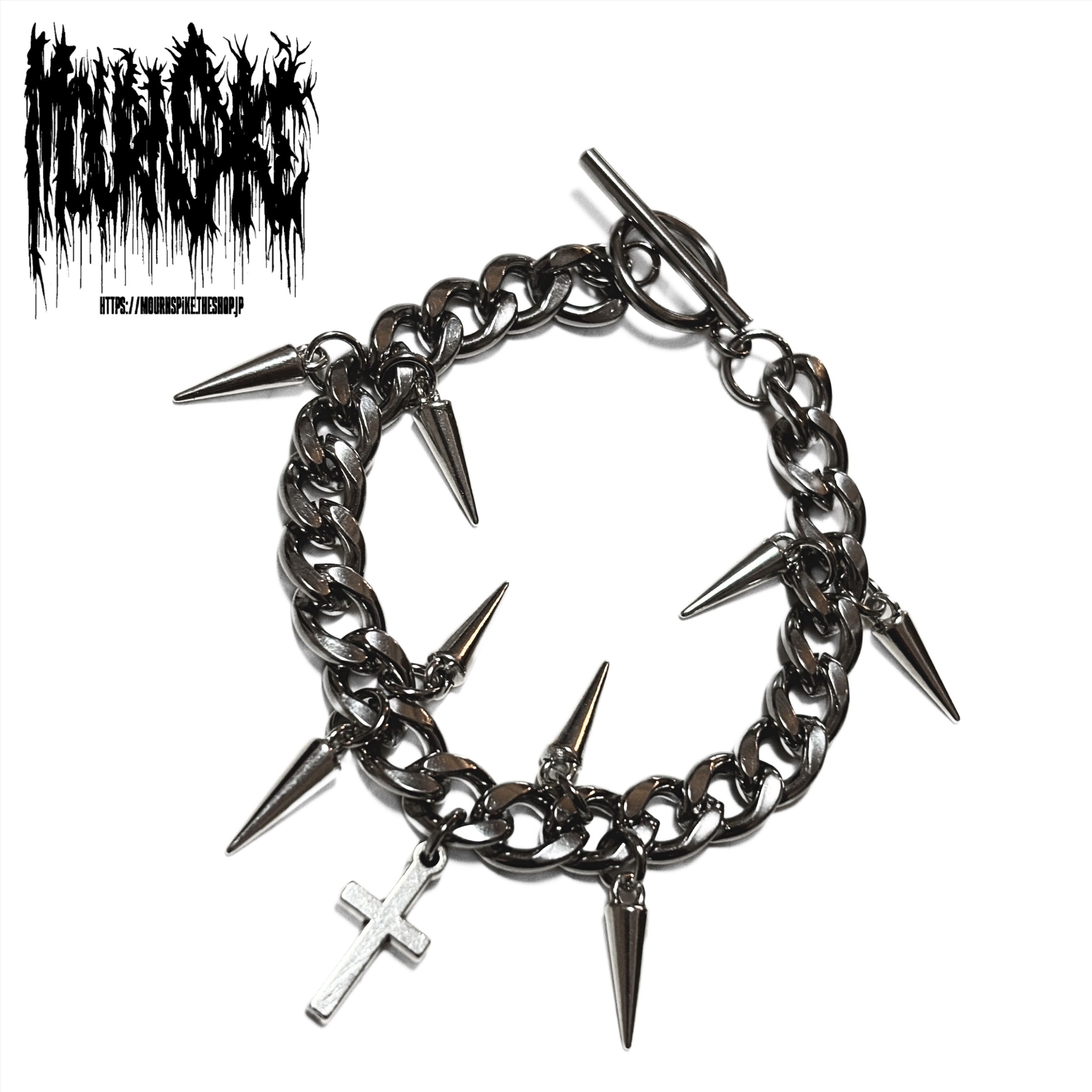 力強いデザインが特徴のブレスレット。スパイクのアクセントが施されたクロスモチーフが手元にエッジを加え、シンプルながら存在感のあるスタイルを演出。